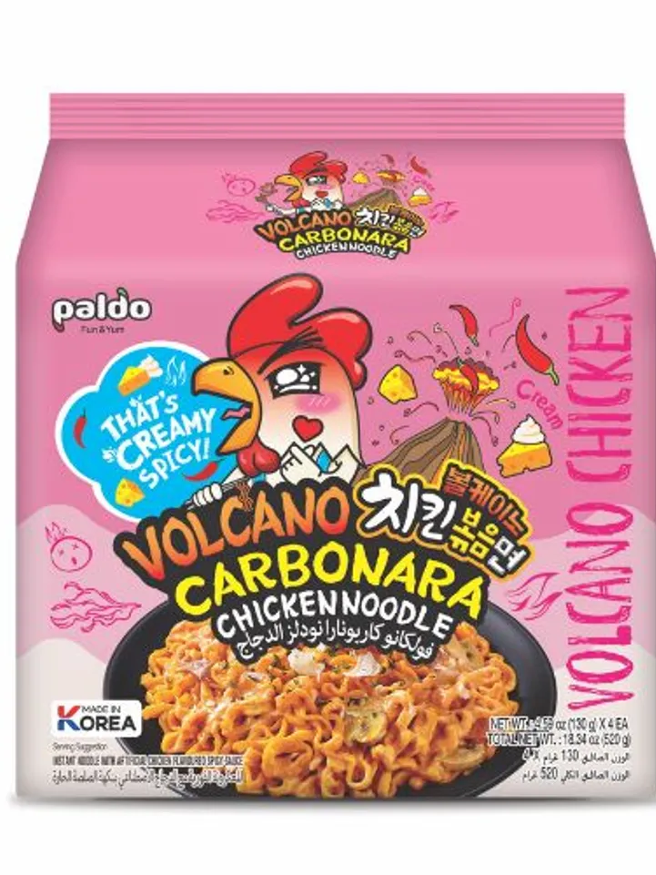 A creamy carbonara twist meets fiery Korean heat in this Arabic-labeled noodle pack. Paldo Volcano Carbonara Chicken Noodles blend rich sauce and spicy chicken flavor for a truly unique halal-certified meal. Perfect for fans of fusion flavors and bold dishes.